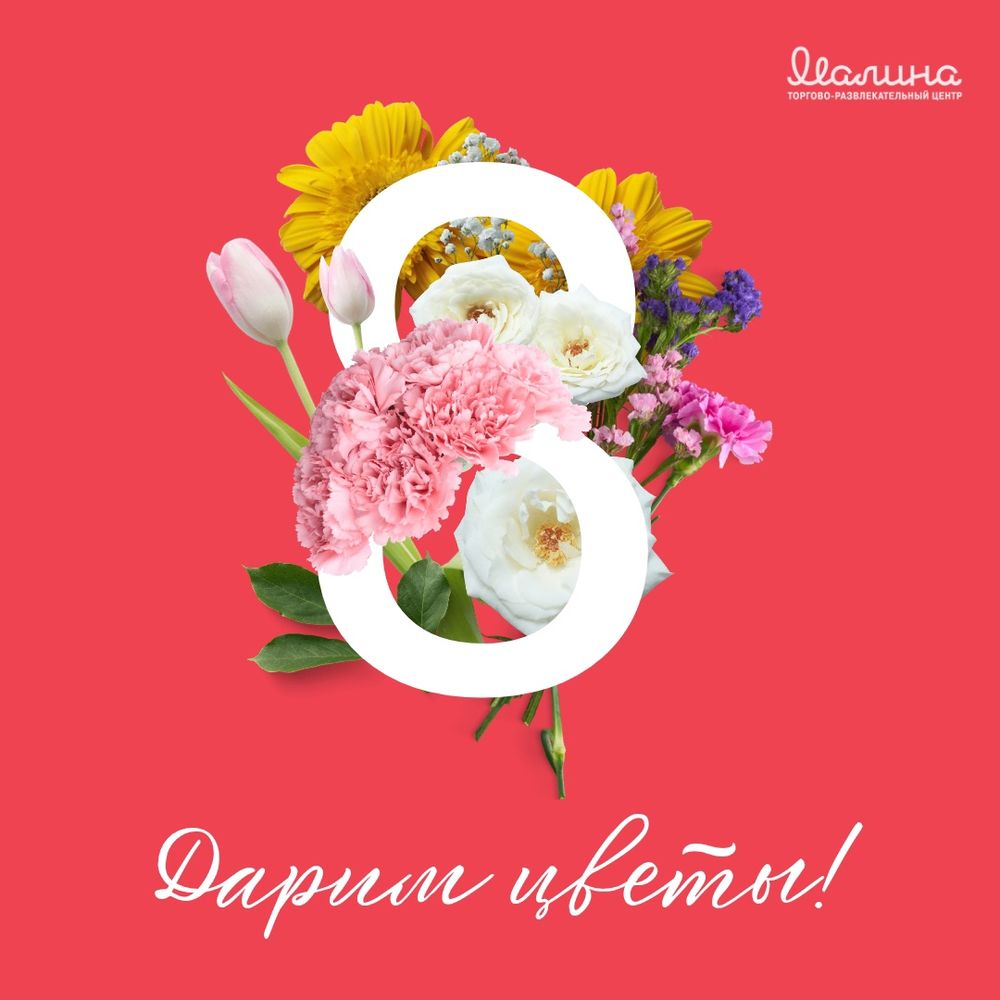 8 марта Дарим цветы в честь праздника 8 Марта! 8 марта с 12 до 15 часов каждая посетительница ТРЦ «Малина» получит от нас тёплые поздравления и цветы в честь Международного женского дня. Будем ждать вас в этот прекрасный день!